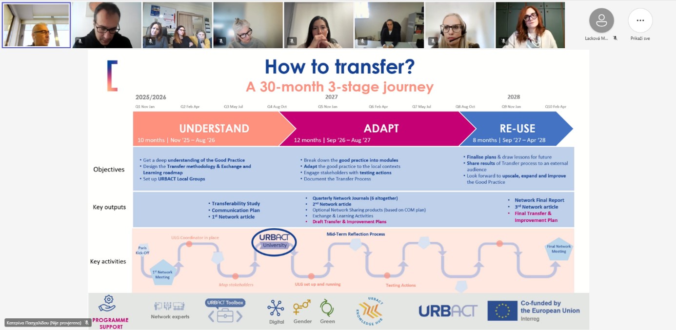 Glavni cilj sastanka bio je uskladiti razumijevanje svih partnera o trenutačnom stanju URBACT mreža za transfer, predstaviti ključne smjernice Tajništva URBACT-a te se dogovoriti o neposrednim sljedećim koracima u provedbi mreže. Poseban naglasak stavljen je na ulogu partnera u prvoj fazi prijenosa dobre prakse i na organizaciju zajedničkog rada u nadolazećem razdoblju.