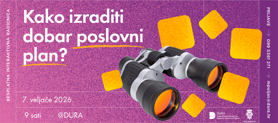 Poslovni plan temeljni je dokument koji sadrži detaljno razrađenu analizu financija, projekcije budućih rezultata poslovanja te rješenja za rizične situacije koje mogu nastupiti u budućnosti. Kako biste naučili napraviti poslovni plan, za vas smo organizirali radionicu „Kako izraditi dobar poslovni plan“ koja će se održati u subotu 7. veljače 2026. u prostorijama DURA-e (Branitelja Dubrovnika 15, 20000 Dubrovnik) s početkom u 9.00 sati.